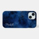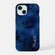 Un coque iPhone 15 avec un design moody bleu foncé aquarelle. Personnalisez-le en ajoutant votre nom complet au coque.