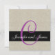 Faire-part de mariage rustique en lin beige avec monogramme violet par Elke Clarke ©2009. Customisez avec vos noms monographiques et couleurs mariages. Ajoutez toutes vos informations mariages au verso de la carte en utilisant les invites de menu faciles à utiliser de Zazzle. Le arrière - plan Linen est un effet photo imprimé.