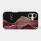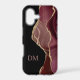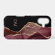 Voici un élégant boîtier téléphonique qui combine le violet, la lavande et le faux agate bordeaux avec des bordures de parties scintillant en faux argent et du noir dramatique. La combinaison forme un design abstrait attrayant d'un côté. Le côté noir solide tient votre monogramme de deux lettres en lavande violet assorti. Unique !