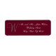 Étiquettes d'adresse de retour de Faire-part de mariage Monogrammes. Conception par Elke Clarke ©. Customisez avec votre initiale monogramme, nom et adresse. Choisissez aussi la couleur arrière - plan et la couleur monogramme. Montré avec le rouge bordeaux et gris initial dans une police de script élégante. Parfait comme étiquette de adresse pour l'avant de vos enveloppes RSVP ou étiquettes d'adresse de retour pour vos invitations de mariage.