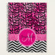 Créez votre propre nom personnalisé et votre planificateur monogramme. L'image principale est un motif numérique empreinte de léopard rose et rose chaud. Remplacez cette grande image à l'avant et à l'arrière par des photos personnelles pour créer un cadeau personnalisé. Il y a une bande de faux parties scintillant de bokeh rose chaud (imprime comme effet photo). Un groupe de formes rondes forme le mandala. Design élégant monogramme de calligraphie cursive en noir et blanc. Au bas du plan se trouve un motif en chevron noir et blanc. Un beau cadeau de retour à l'école pour un enseignant ou un étudiant.