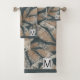 Monogramme Superposition initiale, sur feuilles marron moucheté texturé avec un arrière - plan gris fusain . Serviettes de bain boho rustique motif. Couleurs riches et profondes pour une salle de bain moderne et neutre.