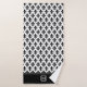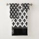Caractéristiques réglées attrayantes de cette trois serviette de morceau un motif noir et blanc de Fleur De Lis. La grande serviette de bain a un motif des symboles noirs de Fleur De Lis sur un arrière - plan blanc. La serviette et la lavette de main ont un motif de Fleur De Lis blanc sur un arrière - plan noir. La serviette de bain a également une frontière inférieure noire, avec votre monogramme dans le blanc sur une bannière fleurie rayée par blanc. Beau !