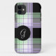Monogram iPhone 5 coque conçu avec un motif plaid funky en violet, vert et noir, et personnalisé avec votre initiale en blanc sur un cercle noir.