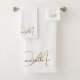 Serviette blanche élégante personnalisée avec monogramme initial or et nom de script, ensemble de serviettes de bain. Rafraîchissez votre décor de salle de bain avec un style typographique moderne et minimaliste.