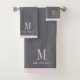 Initiales modernes monogrammes rose vif personnalisées et nom sur gris, avec un ensemble de serviettes de bain en bordure rose vif. Rafraîchissez votre décor de salle de bain avec un style typographique minimaliste.