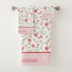Monogrammez ce joli ensemble de serviettes de bain fleuries rose et vert. L'ensemble comprend une serviette de bain, une serviette de toilette et un gant de toilette. Un excellent cadeau de mariage ou de douche de mariée ou achetez-en un pour vous-même pour égayer votre propre salle de bain.