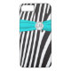 Monogram modern aqua blue, black, and white zebra stripes iPhone 7 case with PRINTED ribbon and jewel brooch.