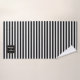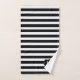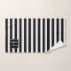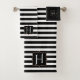 Modern black and white bath towel set with a horizontal striped pattern on the bath and hand towels with the wash cloth done in solid black. A black and gold tone decorative plaque, has a custom white one letter monogram. Personalize the letter to suit your needs. Matching bath decor is available.