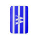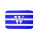 Stylish bath mat, done in a bright blue bold striped pattern. A custom large white one letter monogram, in the middle of the mat, and blue text, is ready to personalize for yourself or as a great gift idea. Comes in three sizes.
