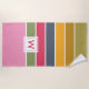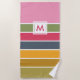 Monogrammed beach towel with bold striped design. The template is ready for you to add your first name initial or your family initial. This happy and cheerful design has a colour palette in shades of pink, green blue and yellow. A charming and timeless stripe pattern for the garden, pool or beach. Please browse my store for coordinating bags and outdoor pillows.