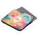 Colourful laptop sleeve features a geometric pattern with triangles and squares in pink, purple, orange, and green with customizable name and monogram in black and grey on semitransparent white round frame. Click on Personalize this template to add your name and monogram. Click on Customize for more options (font style and position) if necessary.