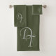 Dark green solid colour monogrammed towel set .Now you can easily customize it with the letters of your choice. This colour is also known as chive green . Light grey lettering and basic yet attractive fonts are included. Green is frequently connected with the Virgo and Capricorn zodiac signs. This is something to think about while choosing your colours.
