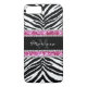 Pretty black and pink sparkle glitter-look background and faux jewellery (No real glitter or jewels - so it's safe) with black and white zebra wild animal pattern print and custom name or text and an adorable chic cute fashion statement.