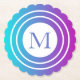 This cute personalized scalloped round coaster features a white geometric design on a multicolored gradient (turquoise, blue, purple) with a customizable monogram in the matching blue colour.