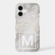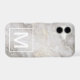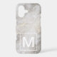 Contemporary iPhone 11 Pro Max phone case features trendy grey marble texture and bold white monogram at the bottom.