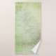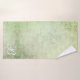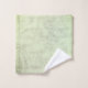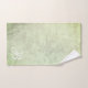 An elegant monogrammed sage green towel set with white initials. A subdued mottled light texture effect. A perfect style accent colour for an earthy neutral spa vibe bathroom.