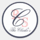 Monogrammed Married Name, Peach, Navy Blue Classic Round Sticker