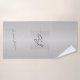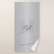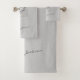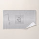 Trendy luxury exclusive looking monogrammed bath towel set featuring a faux silver grey square over a stylish classy metallic grey background. + Personalize it with your black script signature name or family name and monogram name initials.