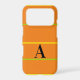 Modern design with a simple feel. Cool orange background with geometric striped lines alternating in bright yellow and citrus green. Fun summer pattern. Personalize Monogram initial in black text. Original designs by TamiraZDesigns.