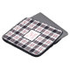 This personalized laptop sleeve features a modern tartan (plaid) pattern with stripes in white, reddish pink and black and a framed monogram in matching colors.