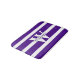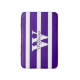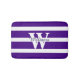Stylish bath mat, done in a bright purple bold striped pattern. A custom large white one letter monogram, in the middle of the mat, and purple text, is ready to personalize for yourself or as a great gift idea. Comes in three sizes.