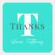 Monogrammed Thank You stickers and envelope seals. Elegant turquoise blue stickers with custom monogram and text. Classy template design with chic script typography and colours. Add your own personalized name, company slogan or quote. Pretty aqua green / blue colour. Great for thanking friends, family and guest. Handy for glamourous Birthday, wedding party, bridal shower, anniversary, business event and much more.