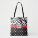 This custom all-over-print tote bag features a mixture of both zebra and polka dot patterns. In the centre, there is a red and black monogram that you can personalize using the custom template.