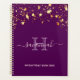 Un arrière - plan chic, féminin, couleur violet foncé, avec des étoiles brillantes en faux or qui coulent, gouttes. Personnalisez et ajoutez votre nom, une lettre monogramme et un titre. Un planificateur pour l'organisation de clients d'affaires, de rendez-vous, de listes d'activités ou de votre vie quotidienne. Le nom est écrit avec un grand script à la main tendance avec des swashes. Pour que les swashes ne suppriment que le nom de l'échantillon, laissez les espaces ou émoticônes devant et après le nom. Lettres rose pâle et violette.