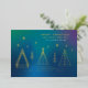 This holiday business card features a gradient background inspired by the northern lights and a simple, modern and masculine design of stars and Christmas tress.