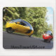 Mousepad with picture of a yellow all-electric MonoTracer and a red BMW-powered MonoTracer
