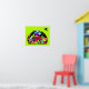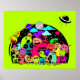 an amusing poster with a friendly group of alien monster characters. The setting has a cosmic theme. You can see planets with rings and craters, spaceships flying around etc.. Colours are both vivid and bright as well as soft and subtle. Set on an bold lime green background.