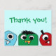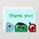 A green monster with a candy corn sweet tooth. The top and bottom are a coordinating geometric pattern. This invite is great for saying thank you after an October Halloween theme birthday party.