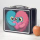 A cute, personalized lunch box for your daughter that consists of two fluffy monster illustrations hugging a heart.