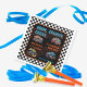 "Boom, Crunch, Crash, It's A Monster Truck Bash!" fun birthday party celebration for a boy. Designed in aqua blue and orange text on a black background, the monster truck artwork really pops. The dark brown dirt tracks add an additional flair to the overall design.