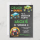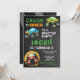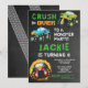 Monster Truck Kids Birthday Party Chalkboard - Start your engines and crush on over to a monster truck party! It all ramps up with this awesome heavy duty invitation. Featuring tough monster trucks on a chalkboard background. The back of the card features tyre marks on concrete. No crazy stunts, just the right touch to set the mood for an action packed party and keep everything right on track.