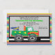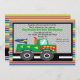 Start your celebration off with this perfect Monster truck invite. Make that special boy's birthday a memorable one! This is a bright green truck with a red mouth and yellow teeth in the front of the truck. It has large, big black tires. It's on a street. It has a chequered grey/ silver background with a black border. The outside of this invitation has multi coloured bright thin stripes. Personalize it with your party information. Check out the many other products and colours in this line. © JW Illustrations