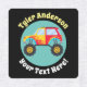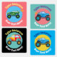 Colourful Monster Trucks with personalized name and message on orange, teal, black and blue backgrounds with peach, blue, teal and yellow centre circles. Use to keep kid's items from getting lost, or for decorating your stuff.