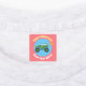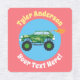 Camions Monster colorés avec nom et message personnalisés sur arrière - plans orange, turquoise, noir et bleu avec pêche, cercles centraux bleus, turquoises et jaunes. Utilisez pour empêcher les objets pour enfants de se perdre, ou pour décorer vos objets.