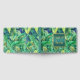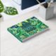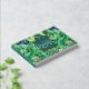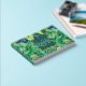 A beautiful green, golden yellow and dark blue seamless pattern comprising of monstera jungle leaves that has a dark faux shimmer teal blue square inlay on the front cover on which a text template for your custom wording reads "guest book" on the front and another on the spine is for your personalized. Both text templates are real foil creating a timeless and luxury look to the cover.