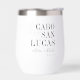 Impressionnez vos invités de mariage de destination avec ces faveurs de mariage chic et personnalisé vin tumbler. Design présente une illustration en feuille de monstère vert foncé avec votre destination mariage alignée à droite (avec Cabo San Lucas) en lettres serif classiques. Ajoutez vos noms sous le script cursif manuscrit, ainsi que l'année. La position de la feuille peut être ajustée et les couleurs peuvent être modifiées pour correspondre aux couleurs de votre mariage à l'aide de l'outil de conception de Zazzle.
