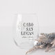 Impress your destination wedding guests with these chic and modern personalized stemless wine glass wedding favours. Design features a dark green monstera leaf illustration with your wedding destination aligned at the right (shown with Cabo San Lucas) in classic serif lettering. Add your names beneath in handwritten cursive script, as well as the year. Leaf position can be adjusted, and colours can be changed to match your wedding colours using Zazzle's design tool.