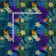 Colourful tropical leaves of palm trees, monstera, plumeria flowers and birds of paradise on a navy blue background.
