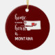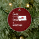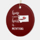 Montana home is where the heart - in mixed script and uppercase white font with the silhouette of the state boundaries and a red heart. Set on deep Christmas red. Personalize with your name or message in white font on one side of the product.