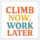 Célébrez votre passion pour l'aventure avec cet autocollant audacieux "Climb Now, Work Later". Doté d'une typographie d'inspiration rétro aux couleurs vives orange, jaune et turquoise, ce design est parfait pour les amateurs de rock, de randonnée et de plein air. Prenez-le sur votre équipement, votre bouteille d'eau ou votre ordinateur portable pour un rappel amusant de donner la priorité à l'aventure. Un incontournable pour les guerriers du week-end et les amoureux de la nature.