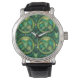A stylish wristwatch with a round face featuring a vibrant green and yellow tropical leaf design. It has a silver case and a black leather strap.