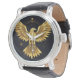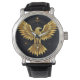 Une image étonnante d'un aigle géométrique doré, au design complexe, aux ailes écartées, positionné contre un arrière - plan sombre abstrait aux motifs mystiques. Idéal pour les thèmes de force, de pouvoir et de liberté.