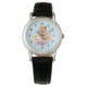 Une montre avec un joli tableau aquarelle d'un lion-mère tenant son bébé. Un joli bouquet fleuri violet en dessous ajoute une touche douce à cette image douce et adorable. Arrière - plan bleu clair.