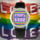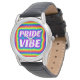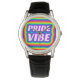 Célébrez la diversité et l'inclusion grâce à ce design vibrant avec "PrideVibe" entouré d'un éventail de couleurs arc-en-ciel. Les teintes rayonnantes contrastent magnifiquement avec la bracelet en cuir noir, créant une pièce audacieuse qui incarne l'unité, l'amour et l'individualité. Parfait pour montrer votre Pride toute l'année avec une montre élégante et colorée.