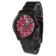 Cette montre pour femmes a un design moderne du milieu du siècle de diamants noirs solides à l'intérieur des contours de diamants noirs avec des lobs roses sous eux, le tout sur un champ de blanc.